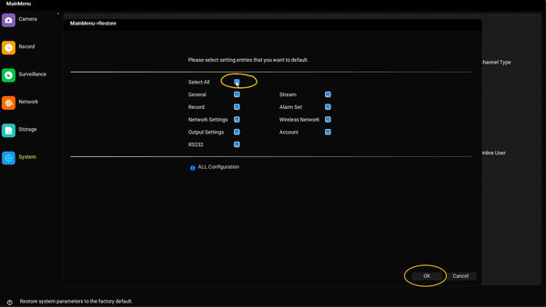 Step 1: Log in to the NVR and navigate to "Main Menu > System > Restore" to access the restore page.